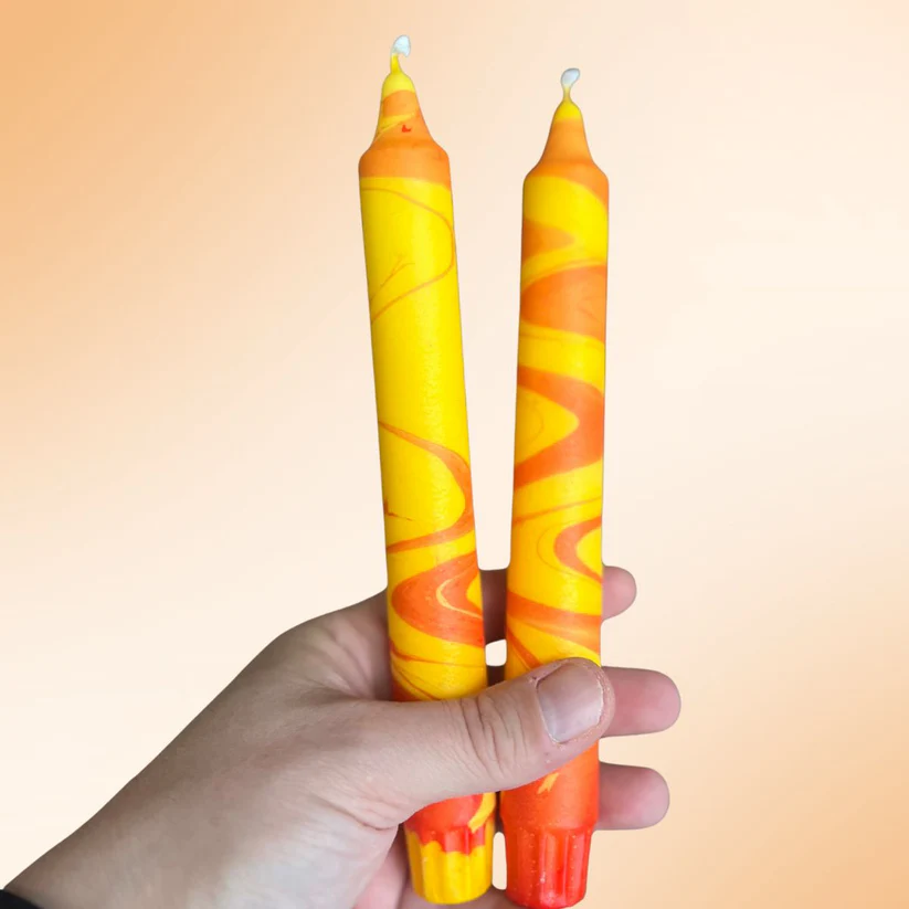 Sunny Swirl är ett marmorerat stearinljus som lyser upp tillvaron med sina glada nyanser av solgult, orange och eldigt rött. Ett energigivande färginslag som passar året om – från sommarfester till höst mys.