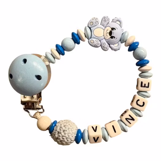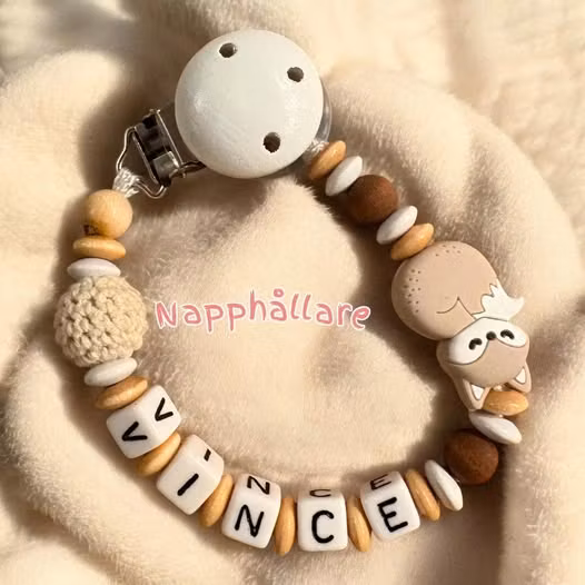Napphållaren är inte längre än 22 cm från clipset och pärlornas färg är giftfri och salivbeständig. OBS! Napphållaren är ingen leksak och ska kontrolleras vid varje användning för att upptäcka slitage.
